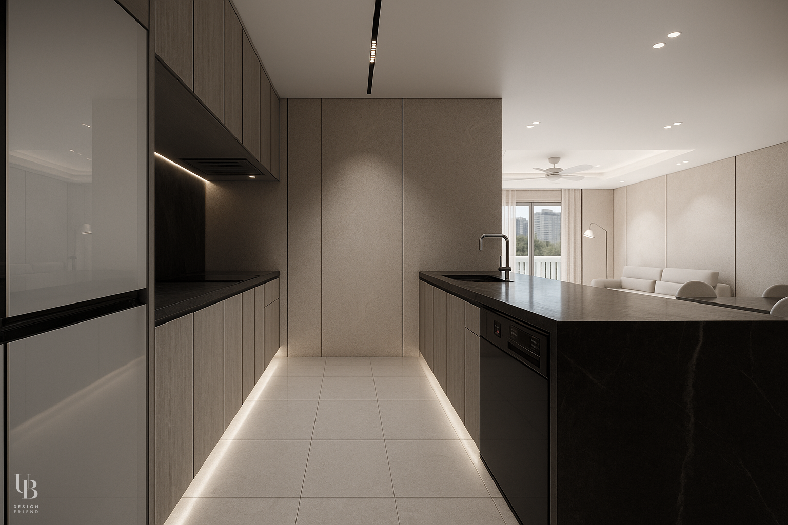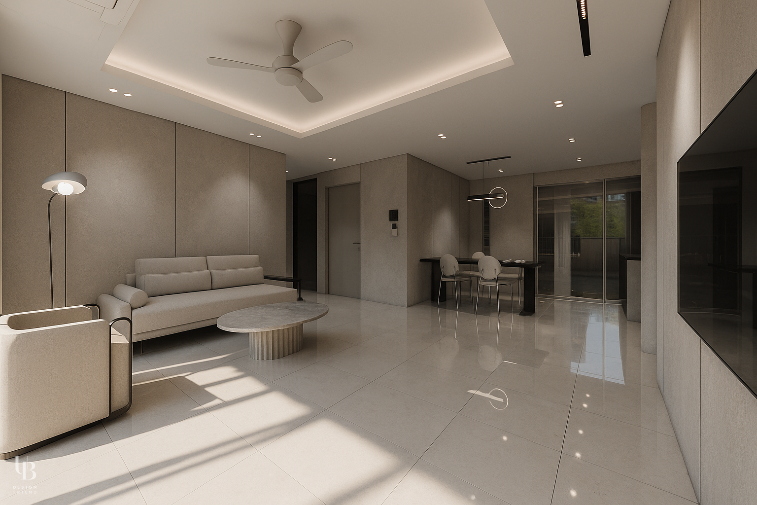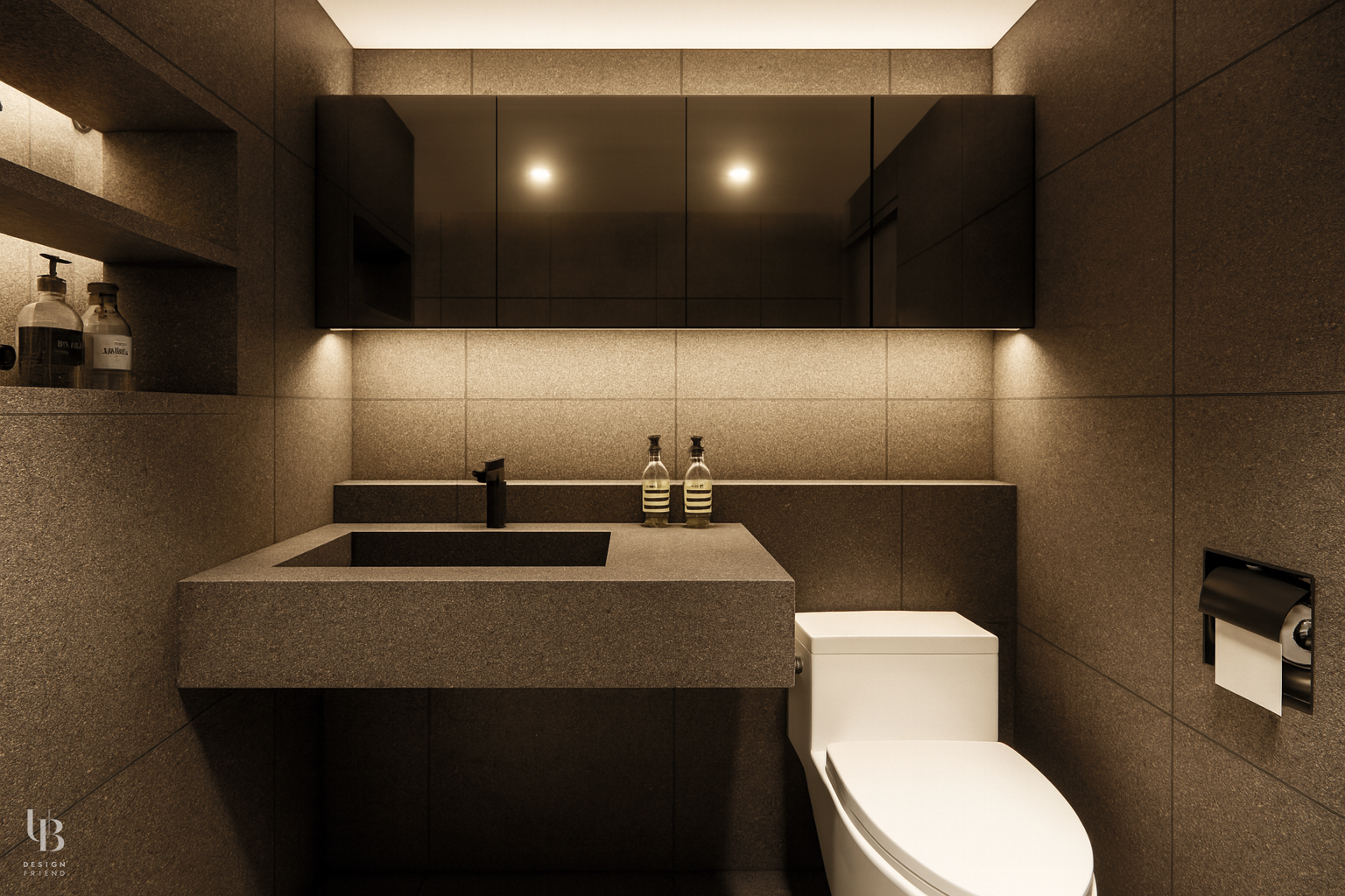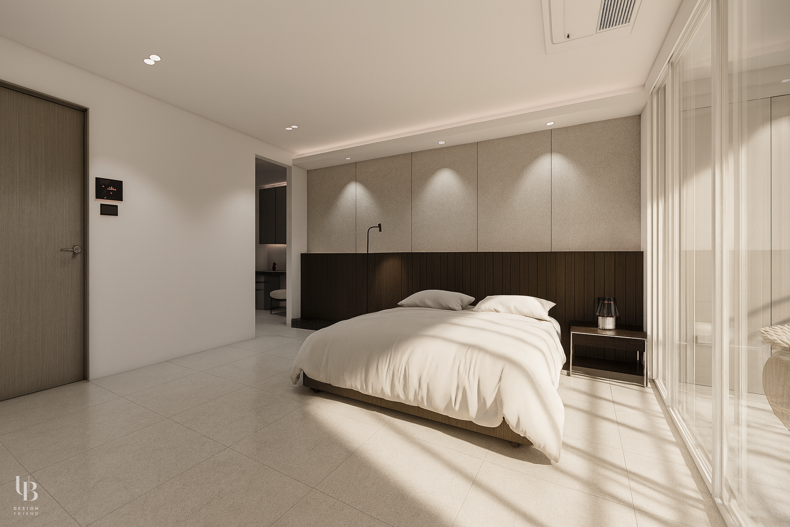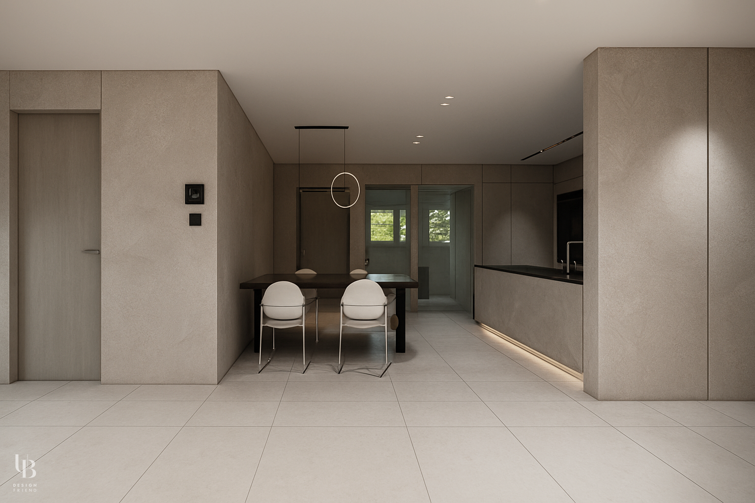 이번 프로젝트는 전체적으로 그레이톤의 절제된 공간에 바닥 역시 유사한 톤의 포세린 타일을 사용해 마감재 간의 경계를 흐리게 함으로써, 바닥과 벽, 천장이 하나의 덩어리처럼 이어지는 인상을 주고 이질감 없는 조화를 통해 시선의 편안함을 고려한 디자인입니다.