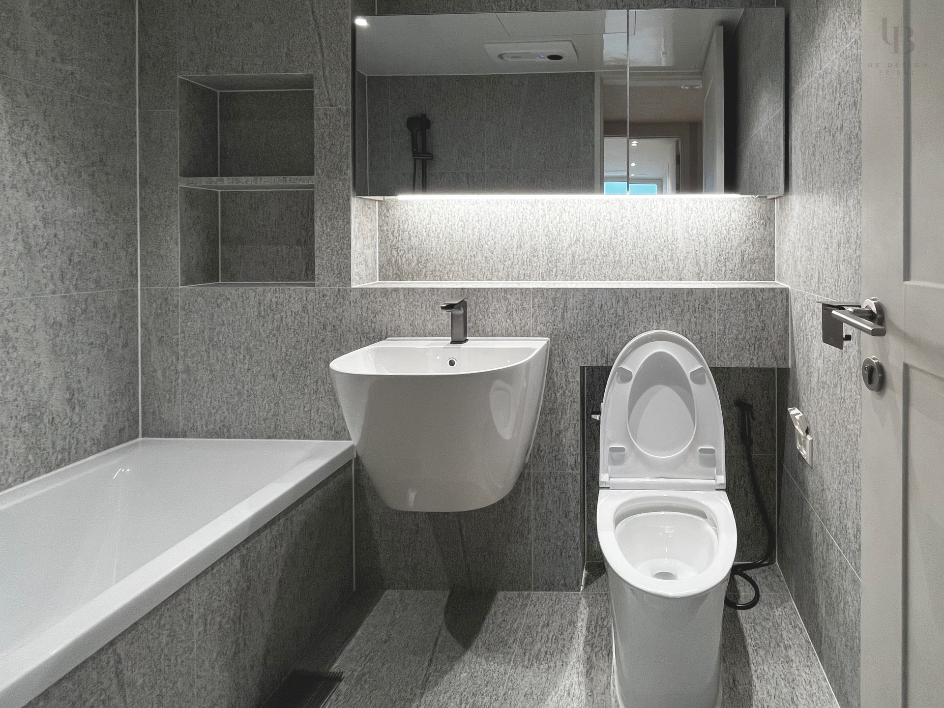 이번 프로젝트는 ‘견고함과 여백 사이’라는 컨셉으로, 공간 전반에 안정감과 절제된 고급스러움을 담아내는 데 집중하였습니다. 간결한 선과 고급스러운 디테일로 완성한 내부는 시각적인 정돈감과 함께 세련된 분위기를 전달합니다. 다크 그레이 톤의 욕실은 공간의 무게감을 조성하고, 전체 컨셉과 조화를 이루는 견고함을 표현했습니다.