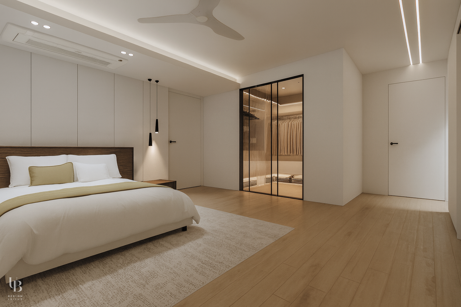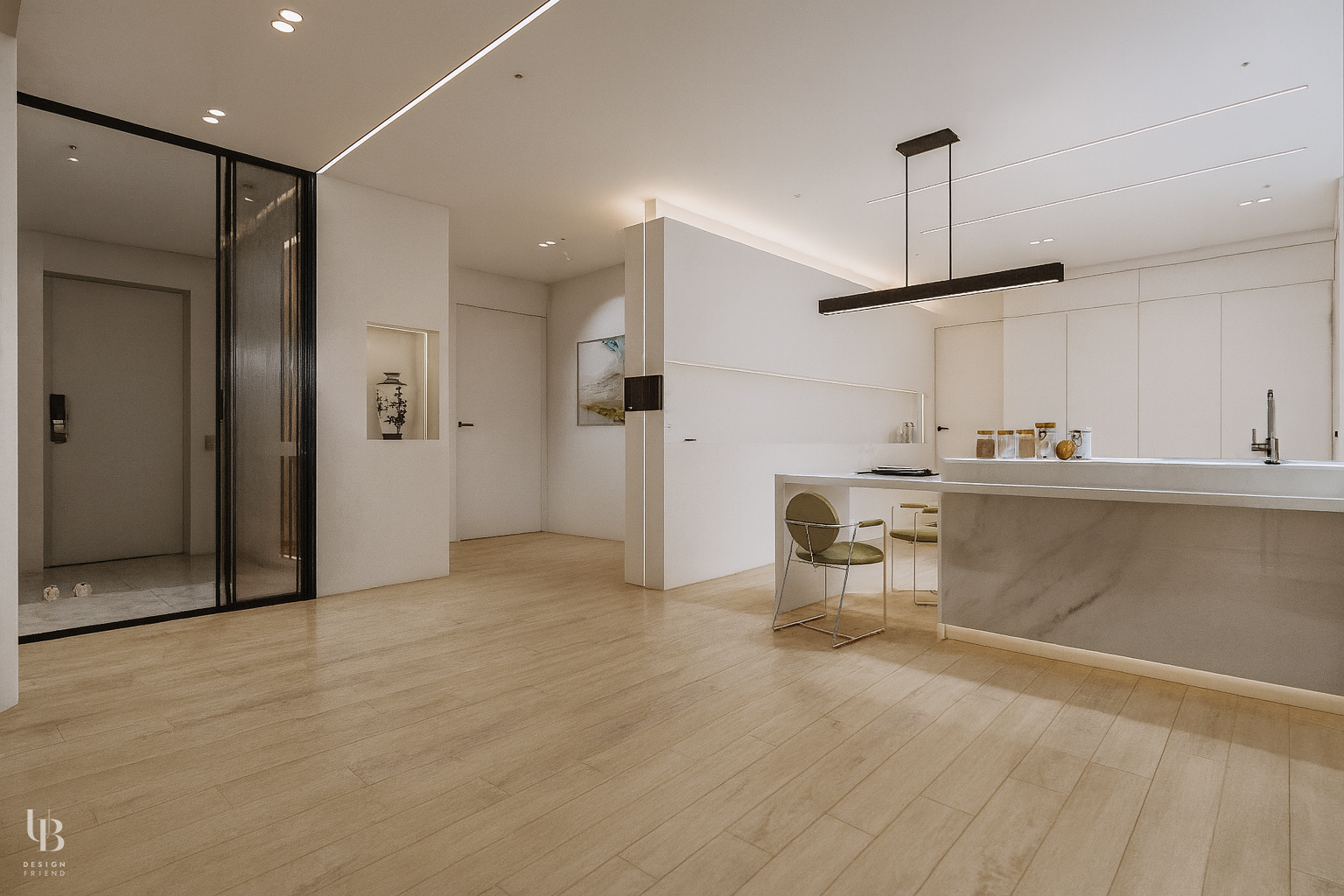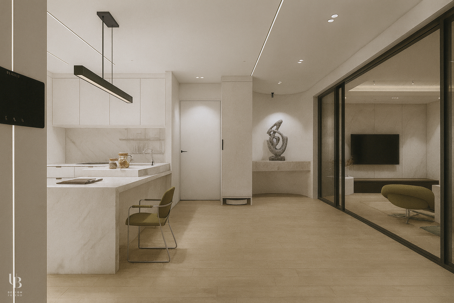 이번 프로젝트는 화이트 컬러를 바탕으로 포인트 컬러와 다양한 조명 디자인이 어우러져 미니멀하고 고급스러운 분위기를 연출한 주거 인테리어입니다. 거실과 부엌은 슬라이딩 도어와 모루 유리를 사용하여 공간의 구분을 불명확히 하였습니다. 이는 시각적 연결로 공간의 개방감을 유지하고, 물리적 구분으로 각 실의 안정감을 찾을 수 있게 고려한 결과물 입니다.