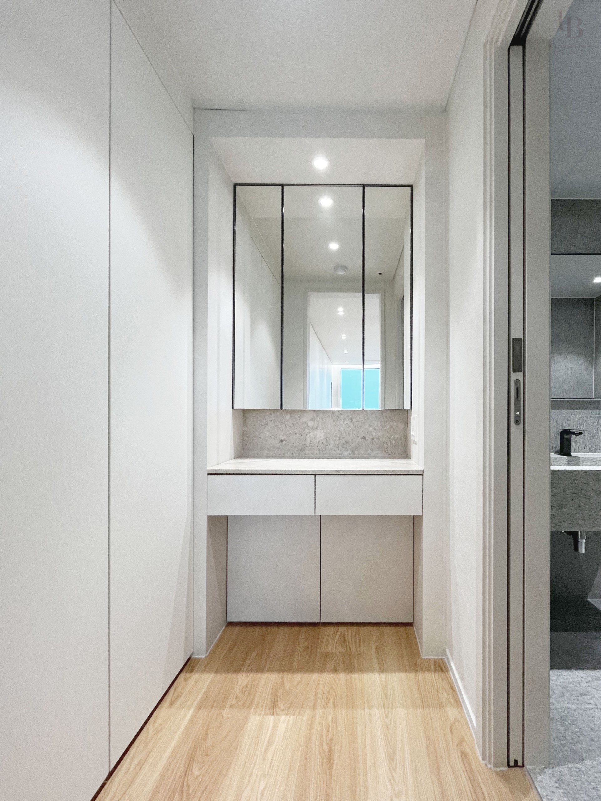 이번 프로젝트는 ‘견고함과 여백 사이’라는 컨셉으로, 공간 전반에 안정감과 절제된 고급스러움을 담아내는 데 집중하였습니다. 간결한 선과 고급스러운 디테일로 완성한 내부는 시각적인 정돈감과 함께 세련된 분위기를 전달합니다. 다크 그레이 톤의 욕실은 공간의 무게감을 조성하고, 전체 컨셉과 조화를 이루는 견고함을 표현했습니다.