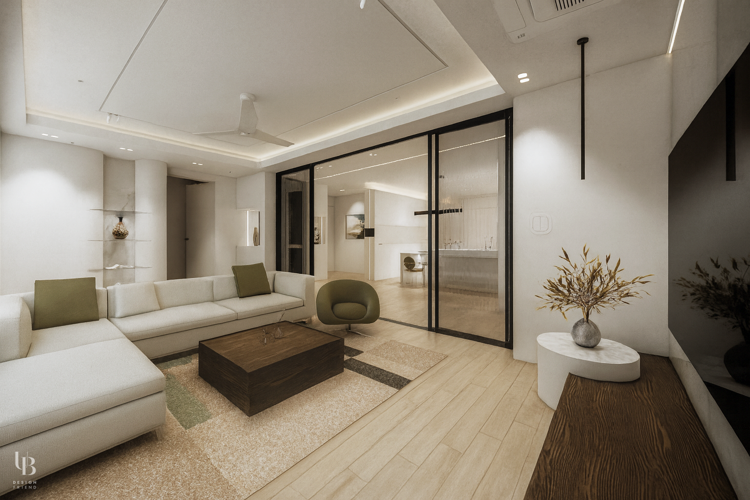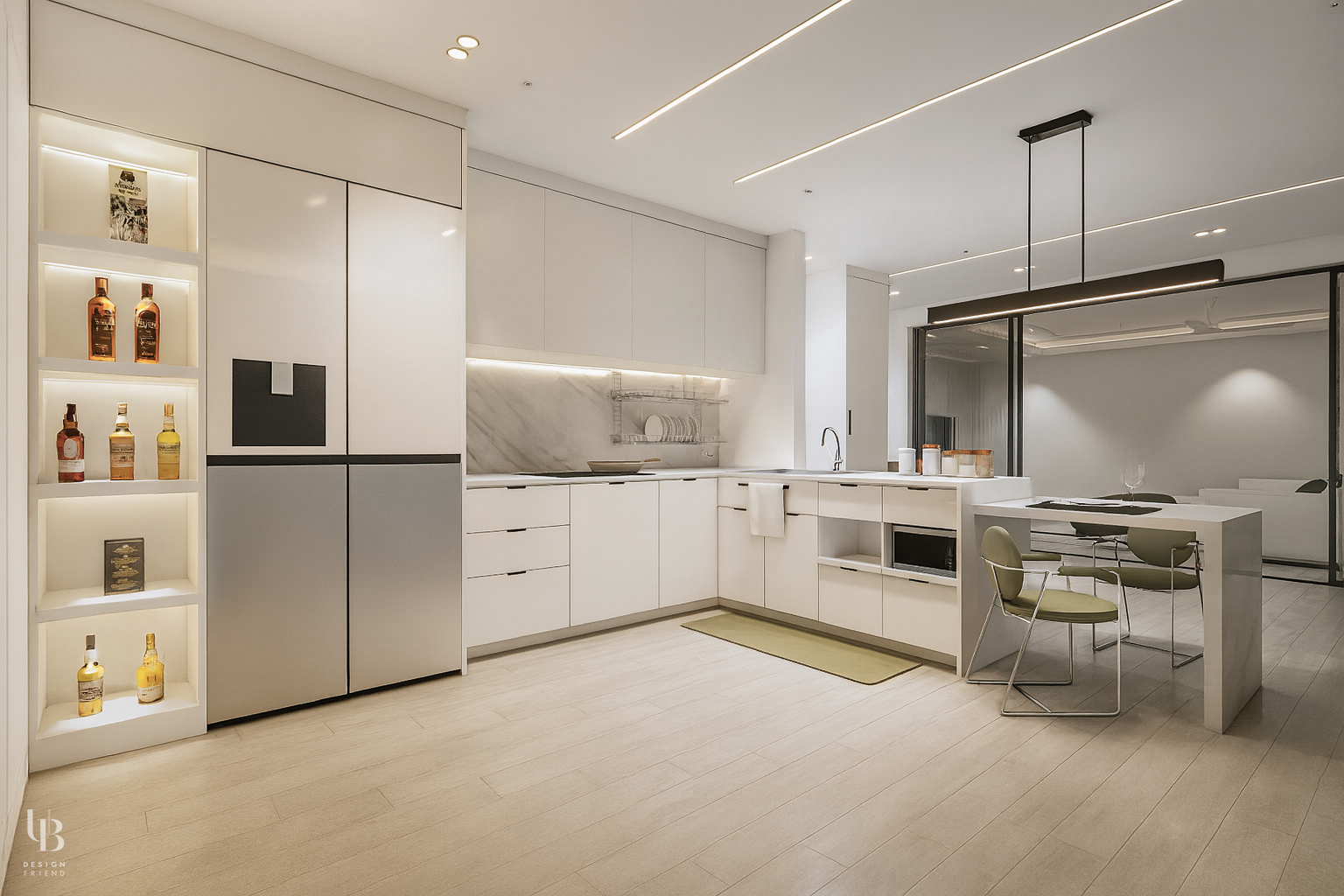 이번 프로젝트는 화이트 컬러를 바탕으로 포인트 컬러와 다양한 조명 디자인이 어우러져 미니멀하고 고급스러운 분위기를 연출한 주거 인테리어입니다. 거실과 부엌은 슬라이딩 도어와 모루 유리를 사용하여 공간의 구분을 불명확히 하였습니다. 이는 시각적 연결로 공간의 개방감을 유지하고, 물리적 구분으로 각 실의 안정감을 찾을 수 있게 고려한 결과물 입니다.