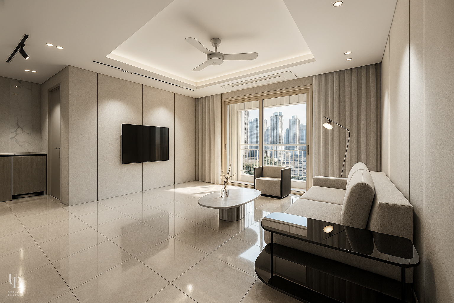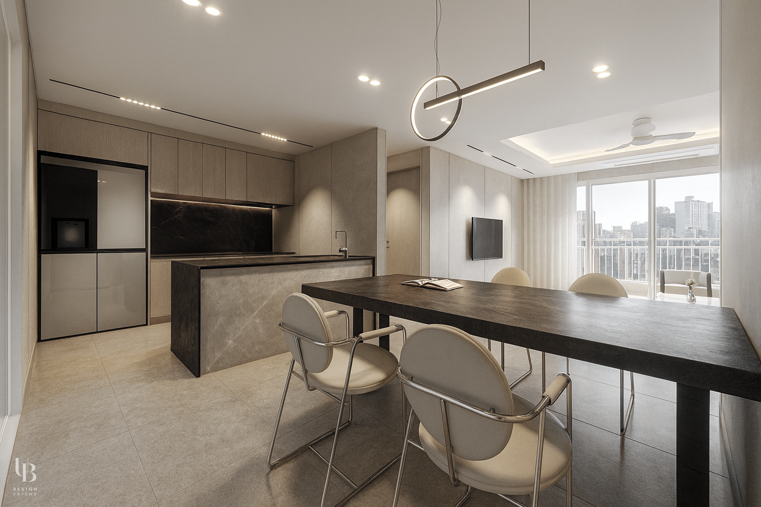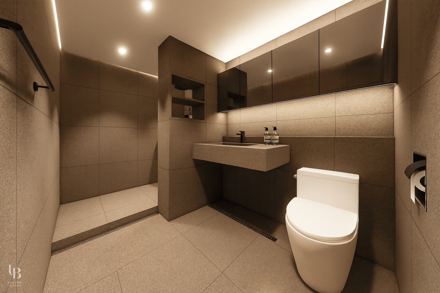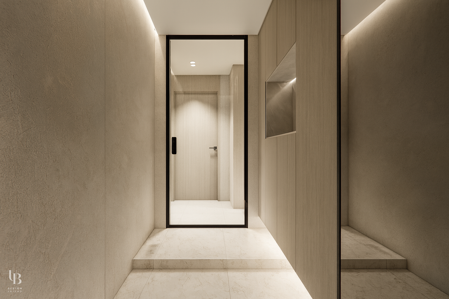이번 프로젝트는 전체적으로 그레이톤의 절제된 공간에 바닥 역시 유사한 톤의 포세린 타일을 사용해 마감재 간의 경계를 흐리게 함으로써, 바닥과 벽, 천장이 하나의 덩어리처럼 이어지는 인상을 주고 이질감 없는 조화를 통해 시선의 편안함을 고려한 디자인입니다.