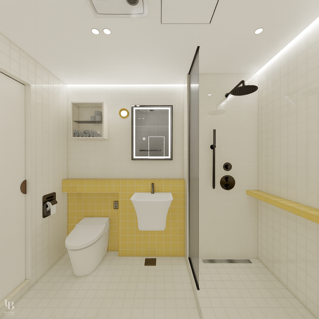 이번 프로젝트는 단순한 주거 공간을 넘어, 사용자의 성격과 내면을 자연스럽게 드러내는 무대로 디자인했습니다. 집 전체는 차분한 베이지 톤으로 정돈하고, 욕실에서 전체 톤과 대비되는 노란색으로 포인트를 주었습니다. 이는 누구나 내면에 지니고 있는 숨겨진 귀여움과 밝은 에너지를 표현한 요소로, 가장 사적인 공간에서 오히려 가장 솔직하고 즐거운 감정을 드러낼 수 있도록 의도한 디자인입니다.