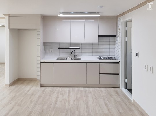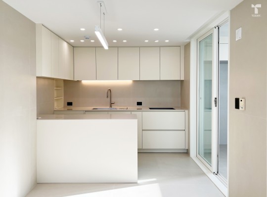 이번 프로젝트는 베이지 컬러의 유광 마감재와 화이트 컬러의 타일로 단정하면서 발랄한 인상을 줍니다. 베이지 컬러의 플랫도어는 차분한 인상을 주고, 작은 사이즈의 화이트 타일이 반복적인 선을 만들어 공간의 리듬감을 부…